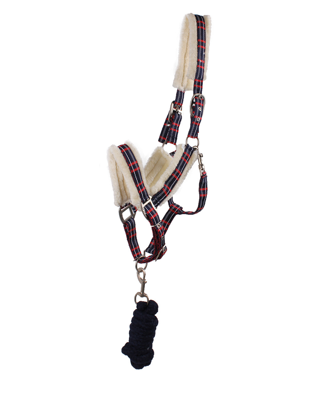 Capezza foderata con pelliccia sintetica sulla nuca, sul naso e sulle guance. Presenta un grazioso motivo a scacchi, fibbie satinate e viene fornita con una longhina abbinata con moschettone.