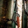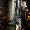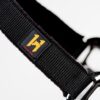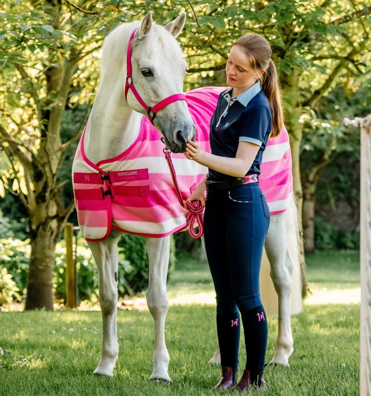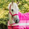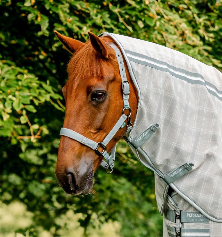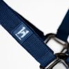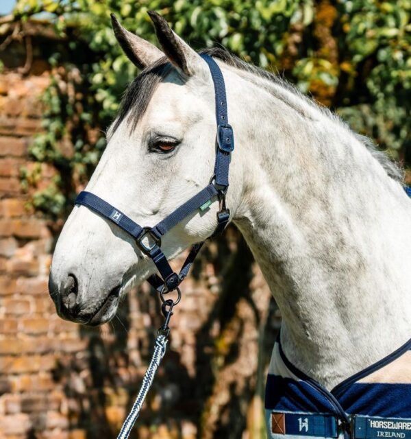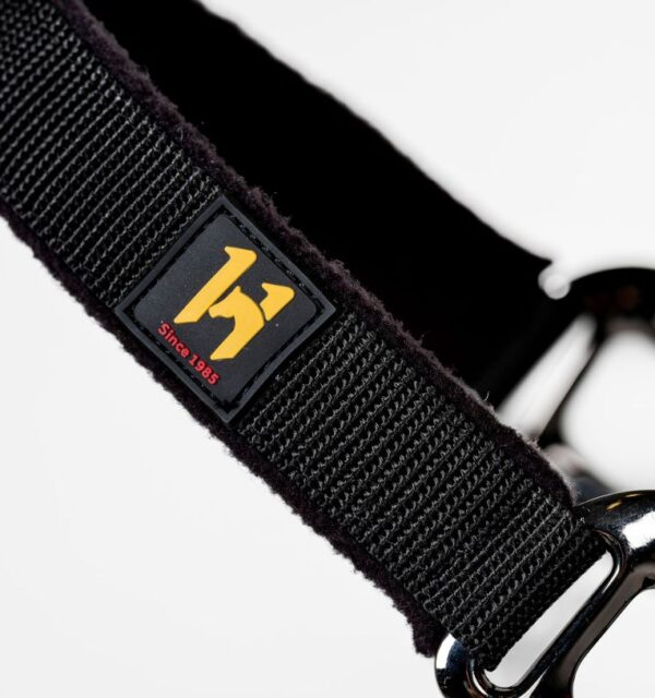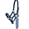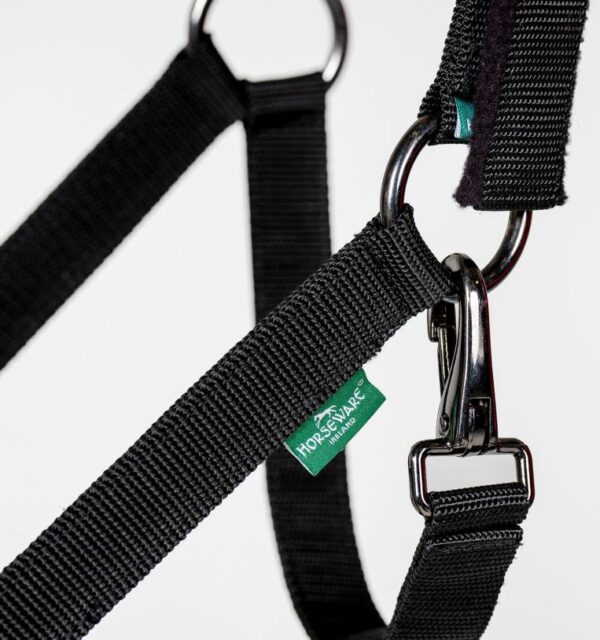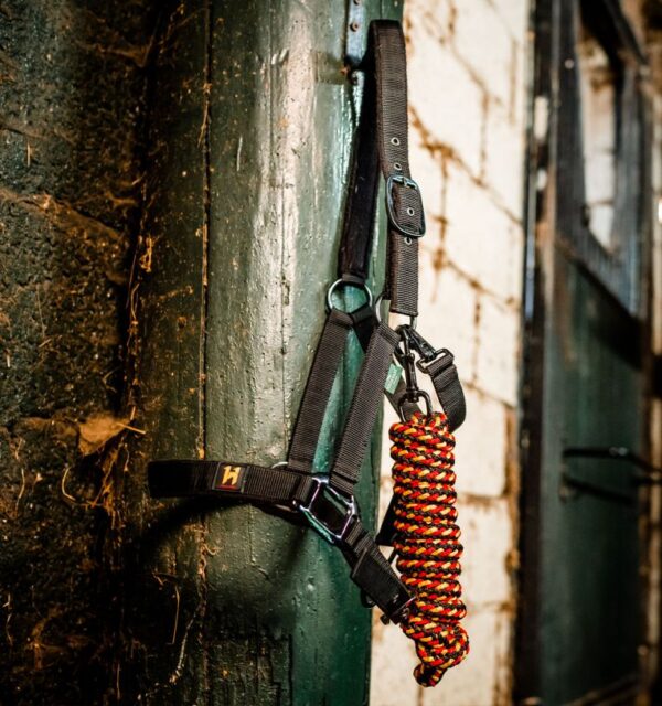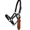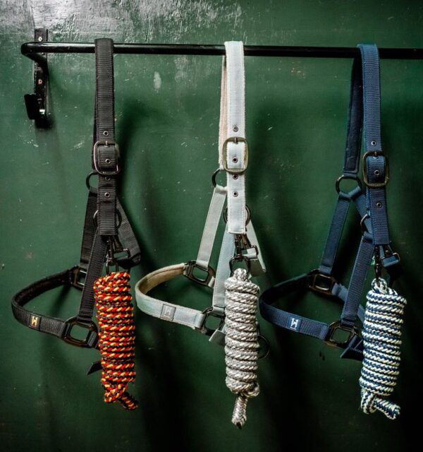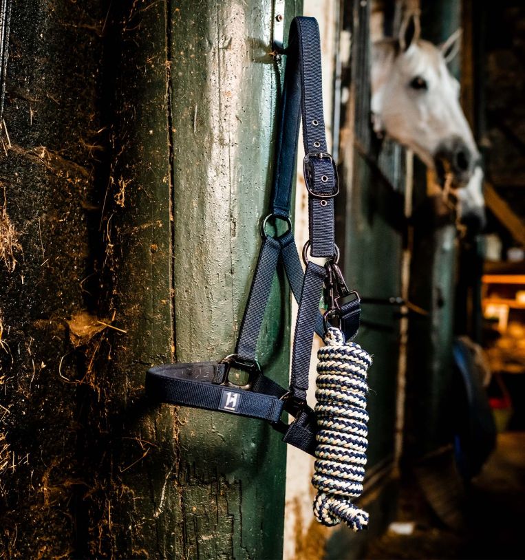 La resistente fettuccia in polipropilene è foderata in pile su nuca e naso, con testiera e capezzina regolabili per adattarsi comodamente al muso del cavallo. Le robuste parti metalliche color canna di fucile aggiungono un tocco di eleganza.