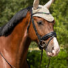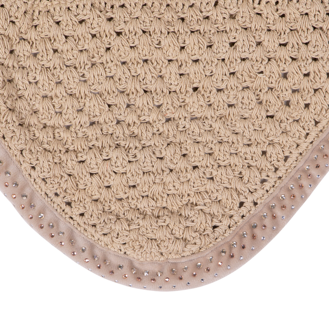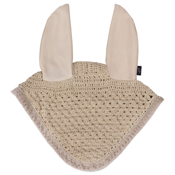 Lussuosa cuffia lavorata all’uncinetto, ha orecchie elastiche per un maggiore comfort. Il bordo della cuffia è decorato con piccoli strass.