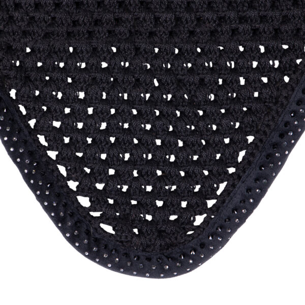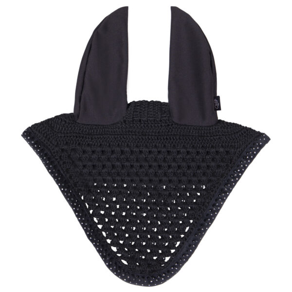 Lussuosa cuffia lavorata all’uncinetto, ha orecchie elastiche per un maggiore comfort. Il bordo della cuffia è decorato con piccoli strass.