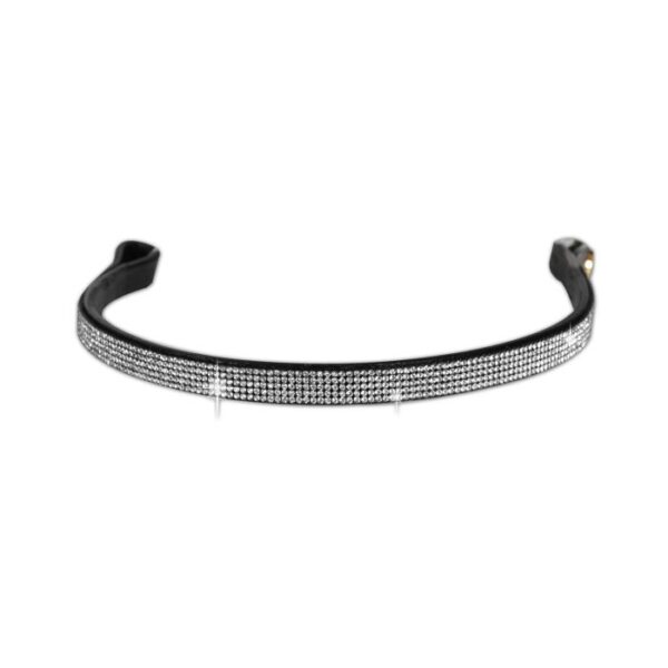 Frontalino per briglia all’inglese realizzato in cuoio nero con file di strass brillanti per uno stile unico e particolare.