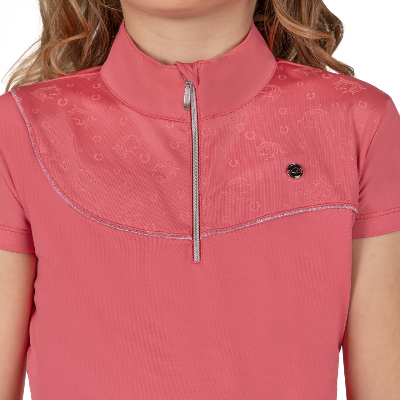 La maglietta sportiva Junior Jaily è realizzata in tessuto elasticizzato e presenta una stampa di unicorno e ferro di cavallo sulla parte anteriore. Il cordino decorativo glitterato e la spilla a forma di Q conferiscono alla maglietta un aspetto allegro.