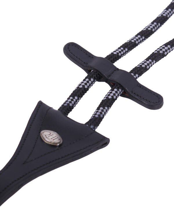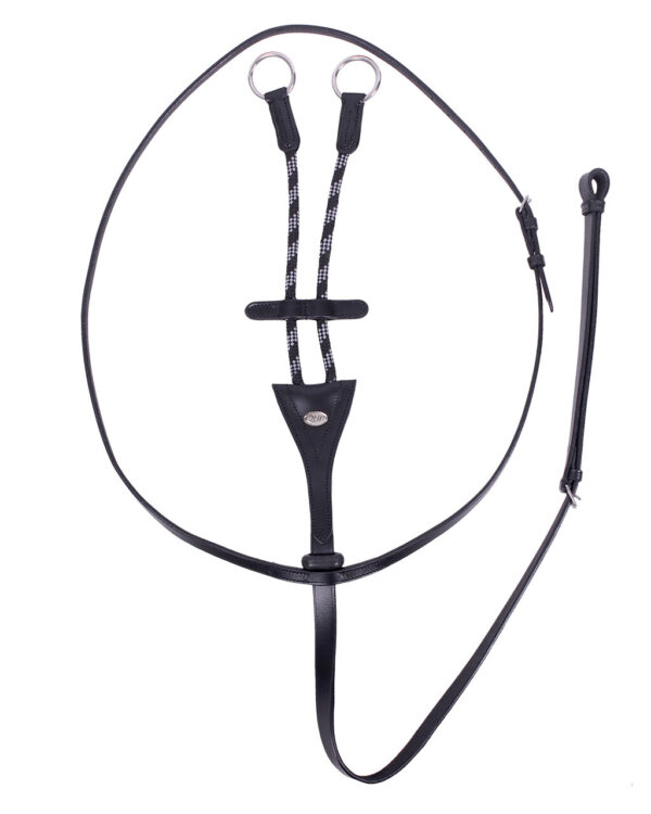 Martingala a collare in pelle e cordino bicolore. Dispone di un fermo in pelle tra le corde. Regolabile su due punti.