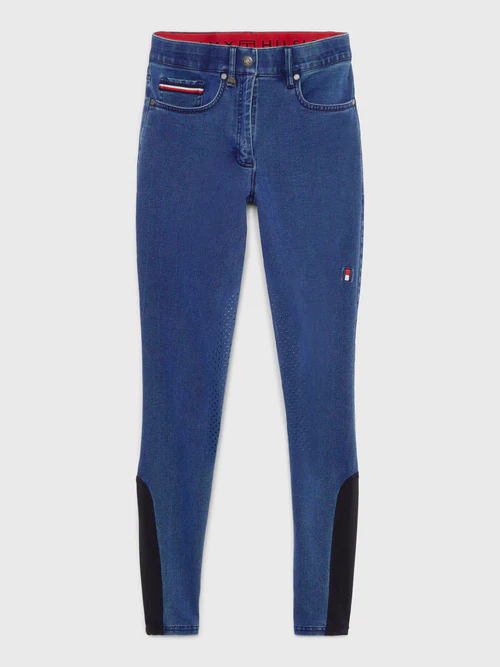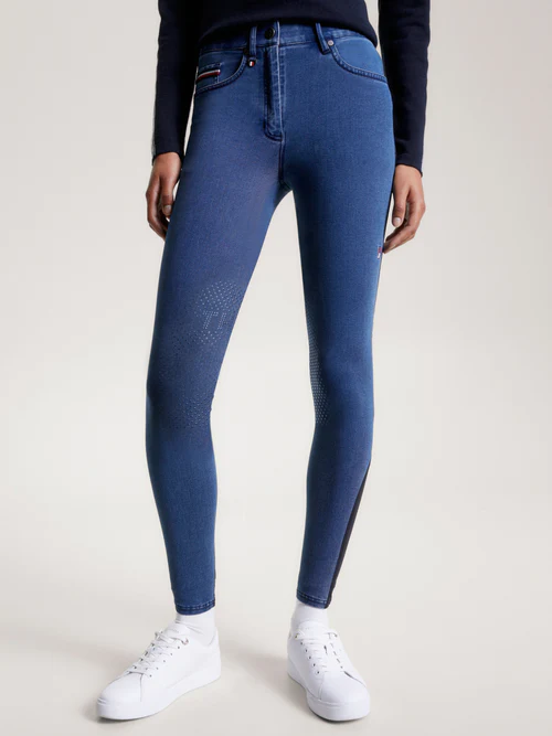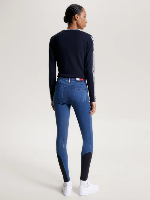 Il look è completato dall’iconico profilo a righe global Tommy Hilfiger su un classico design a 5 tasche con l’iconico logo con bandiera Tommy Equestrian sulla cintura posteriore, targhetta con bandiera in metallo sul passante per cintura, fettuccia Global Stripe sul taschino portamonete e grip in silicone sul ginocchio. Tessuto denim funzionale con comfort elasticizzato in 4 direzioni.