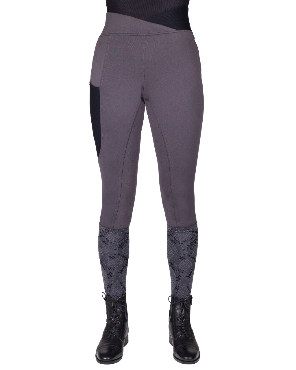Leggings da equitazione sportivi da donna full grip. I leggings da equitazione Djune hanno una cintura accattivante e finte tasche a fessura sul retro. Puoi riporre facilmente il telefono nella pratica tasca a bustina sulla coscia destra. Lโinterno della cintura ha una stampa coccodrillo. I leggings da equitazione sono realizzati in un tessuto pregiato ed ideali per lโestate.