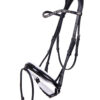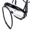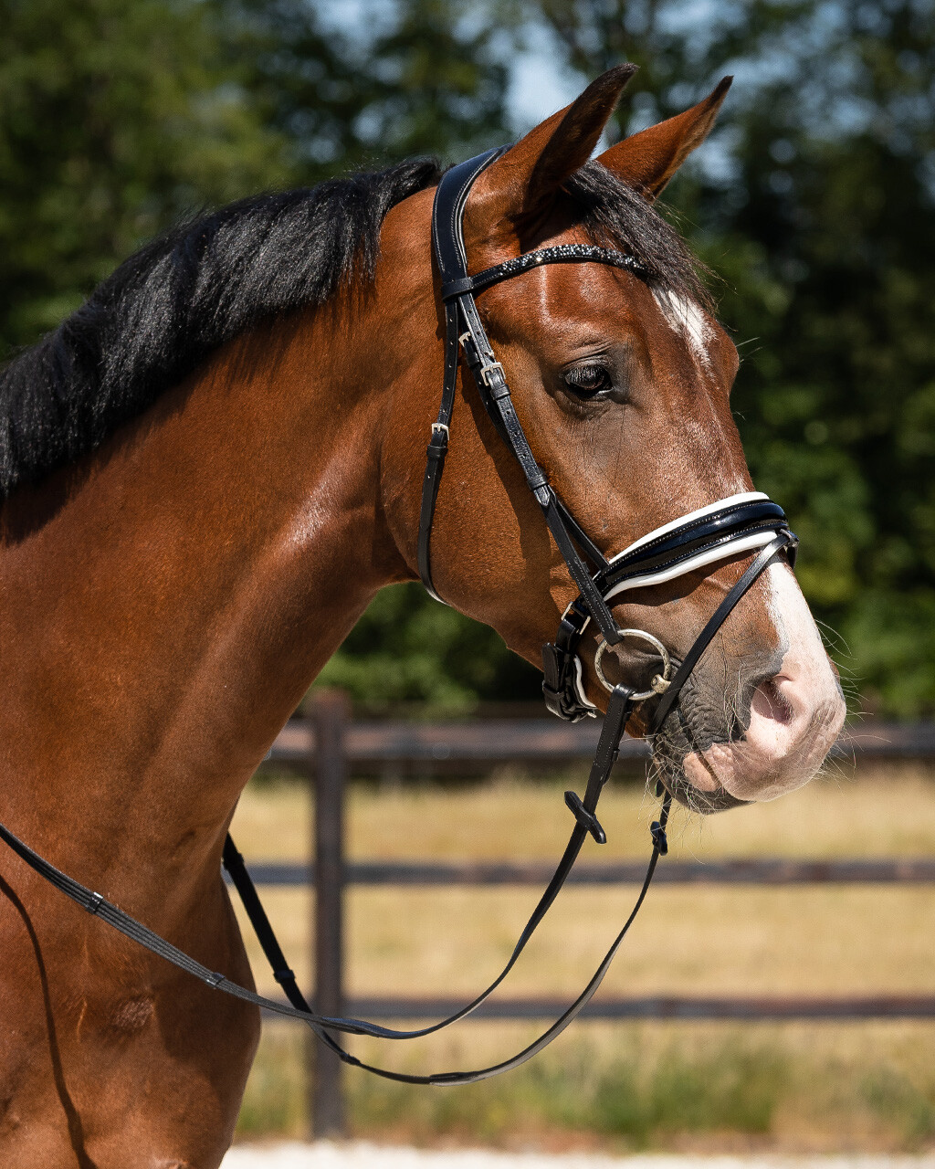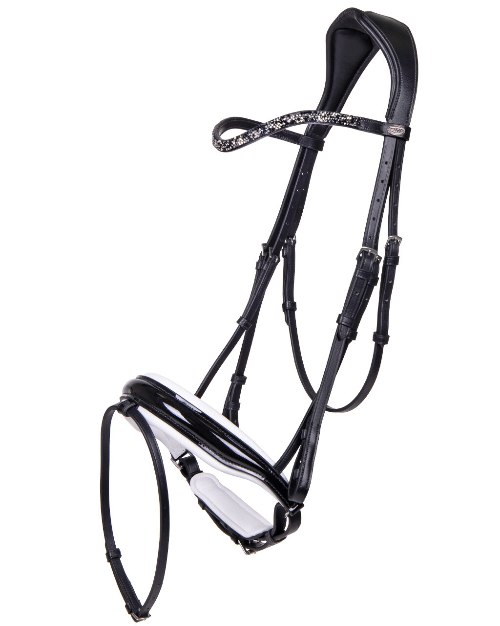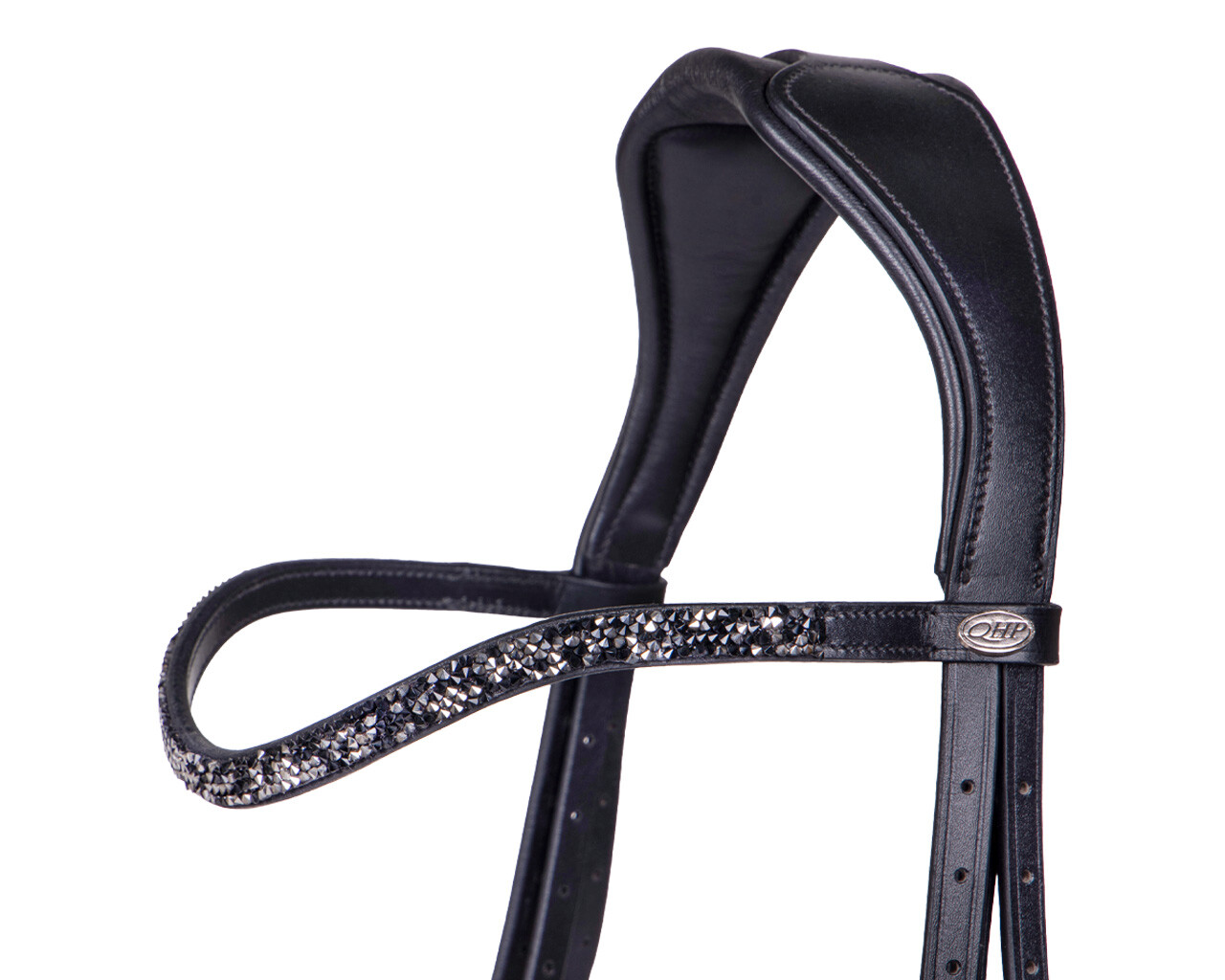 Questa elegante testiera con capezzina in pelle verniciata è la perfetta combinazione tra eleganza e comfort. Il frontalino è ricoperto di strass a forma di diamante. Grazie al copricapo anatomico e alla capezzina con morbida imbottitura, è molto comoda da indossare.